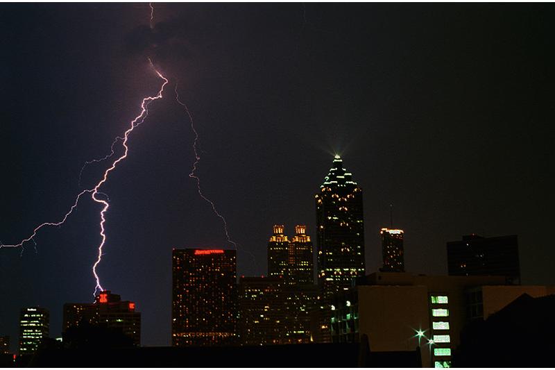 A Classic Award Winning Capture! I am happy to have this one back in my collection after so many years. Restored from the actual negative. In the summer it is common to have many evening thunderstorms in Atlanta. This one time I captured this amazing bolt of lightning. 400iso film.